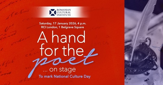 Spectacolul „Aplauze pentru Poet“ este propunerea Institutului Cultural Român de la Londra. Evenimentul va avea loc sâmbătă, 17 ianuarie, la sediul ICR Londra, şi va reuni actorii Emilia Popescu şi András Demeter, alături de pianistul Cătălin Raducanu.