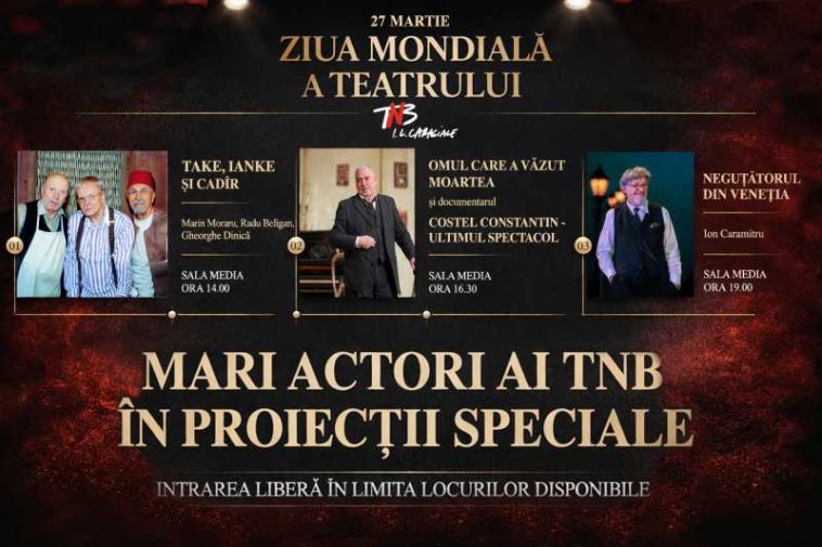 Teatrul Național ‘I.L. Caragiale’ din București invită publicul pe 27 martie, de Ziua Mondială a Teatrului, la evenimentul special ‘Mari actori ai TNB în proiecții speciale’.